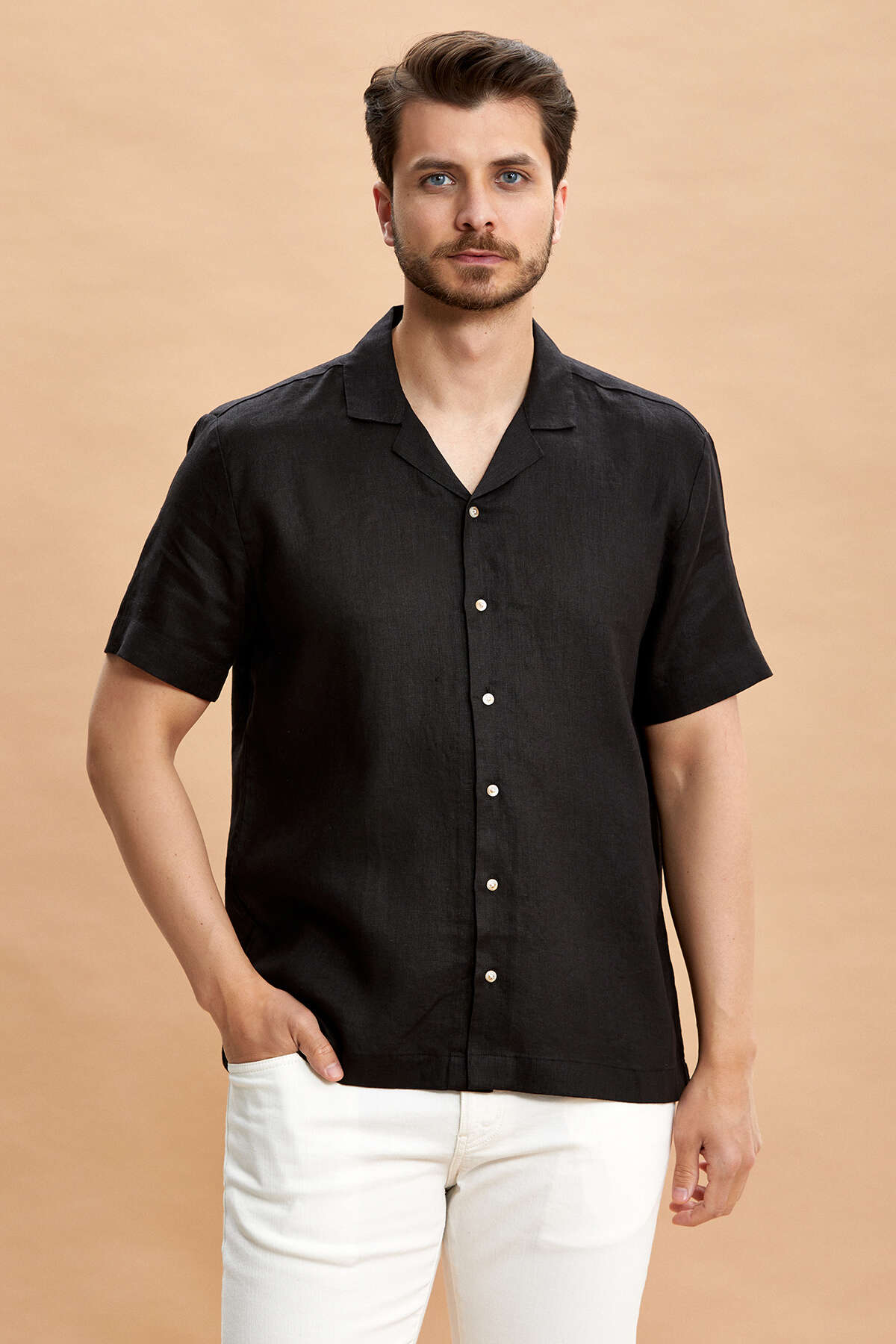 Apres Siyah Kısa Kollu %100 Keten Gömlek
