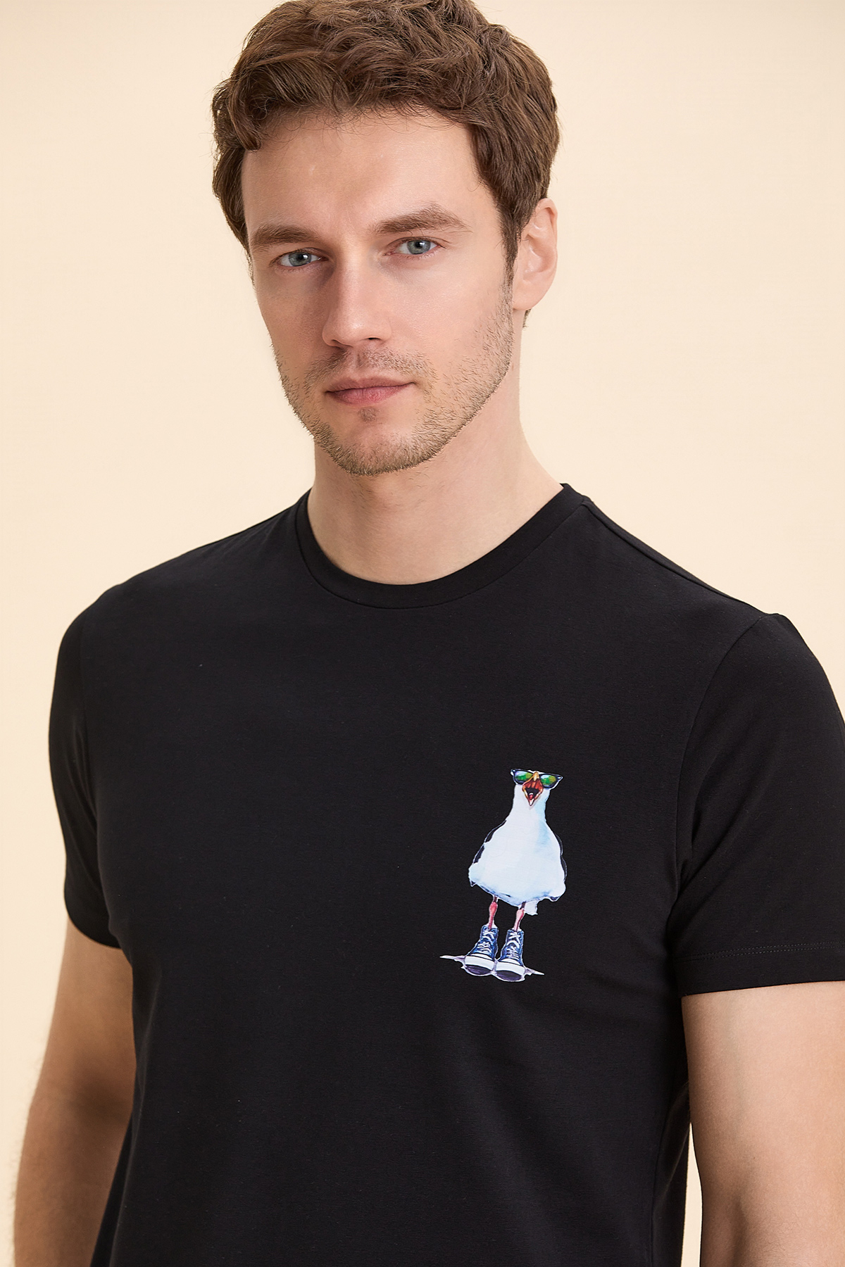 Beauti-gull Siyah Pamuklu Martı Baskılı Tişört