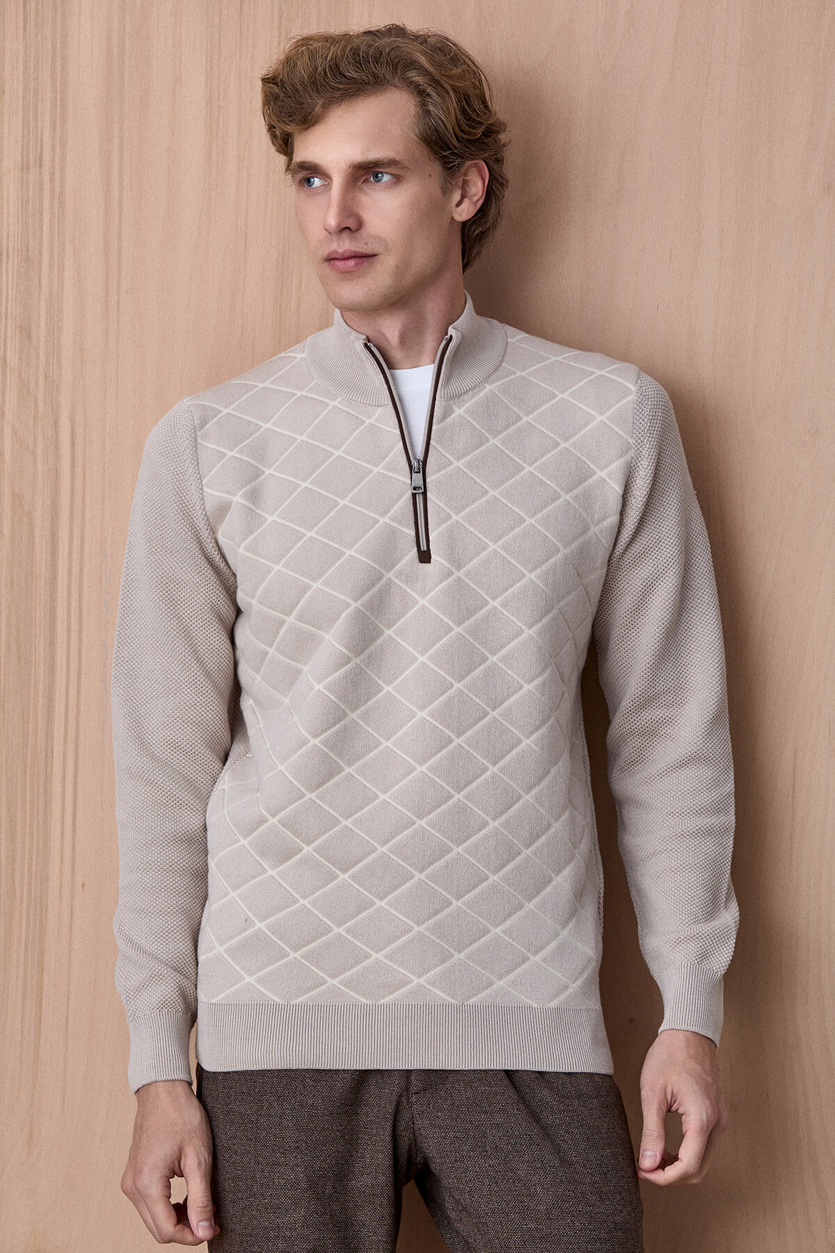 Borger Açık Bej Pamuklu Kısa Fermuarlı Triko