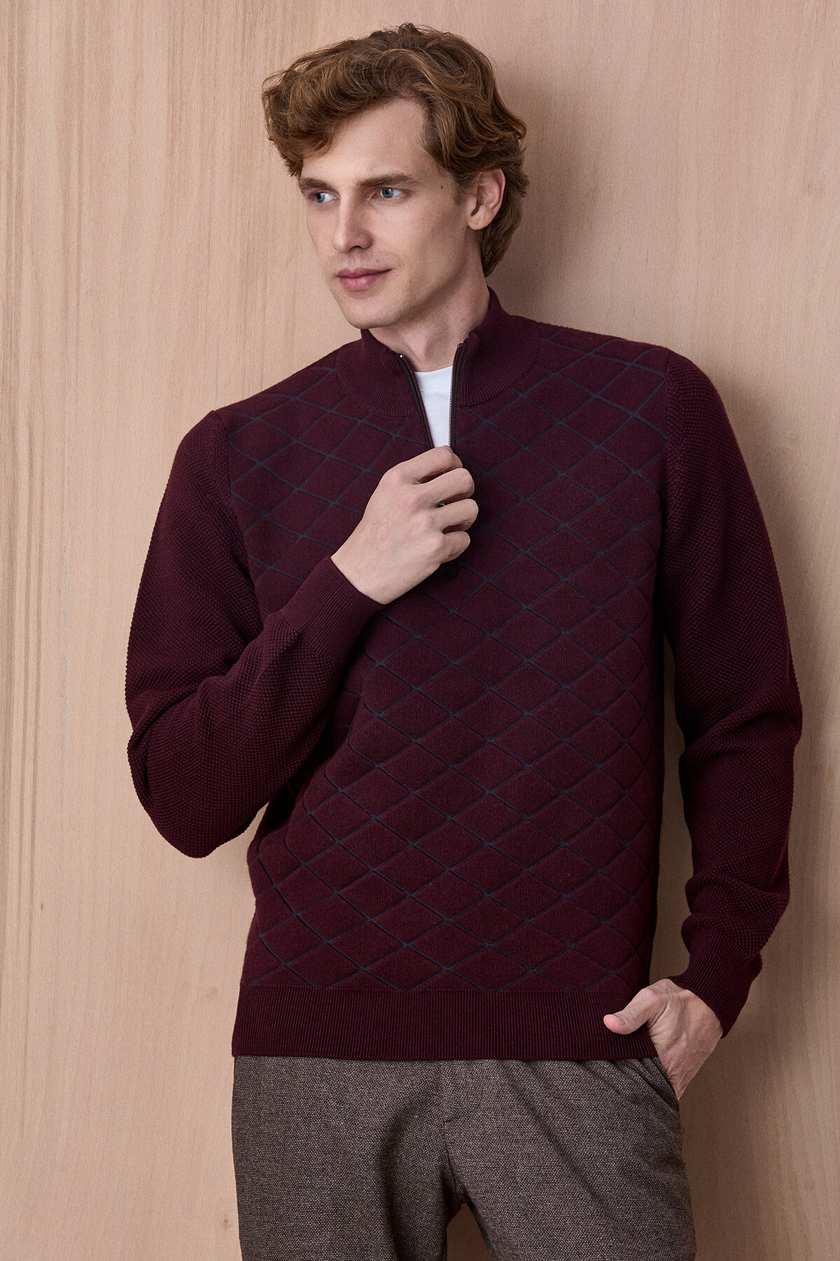 Borger Bordo Pamuklu Kısa Fermuarlı Triko